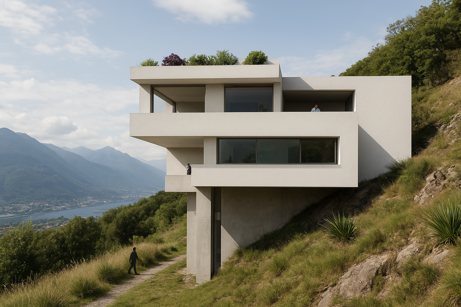 Ma il cuore pulsante della casa sono le ampie terrazze panoramiche, veri palcoscenici aperti sul paesaggio: Locarno si svela ai piedi, il Lago Maggiore riflette il cielo, le montagne cingono l’orizzonte.